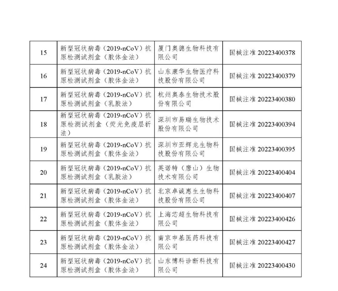 4月2日,國家藥監局再次審查批準1個新冠病毒抗原檢測試劑產品,山東博科診斷科技有限公司新型冠狀病毒(2019-nCoV)抗原檢測試劑盒(膠體金法)獲證。 截至4月2日,國家藥監局已批準24個新冠病毒抗原檢測試劑產品。 已批準抗原試劑列表 來源:國家藥監局官網