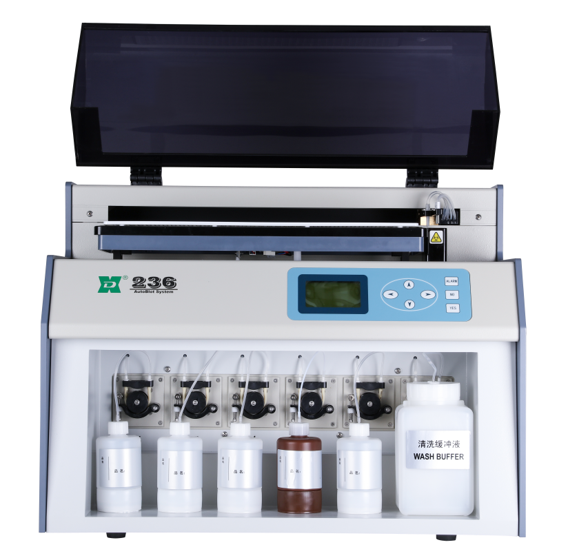 自動蛋白印跡儀是一臺智能化自動操作蛋白(免疫)印跡(Western blot)試劑盒的儀器,按照實驗要求,并添加檢測標本,用已設定的操作程序由機器來自動配液,吸液,孵育,沖洗,加底物液等全過程,同時,吸液量、分液量、時間、孵育平臺擺動速度等都可以按實際需要來設定或編輯。