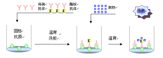 方法:用已知抗體包被,加入待測血清,再加酶標抗原,酶標物抗原與待檢物競爭與包被物結合。加底物顯色。