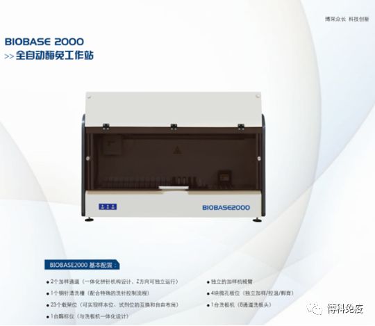 BIOBASE2000是一款性能優(yōu)異并且經(jīng)濟適用的全自動酶免工作站,其基本配置為2個加樣通道,4個微孔板位,1臺洗板機(含4個洗板液通道)、1臺酶標(biāo)儀,還有包括樣本載架在內(nèi)的5種共23個載架位。典型處理能力為,一次運行可以處理90余樣本的4項檢測,或者40余樣本的8項檢測(例如術(shù)前病毒8項)。
