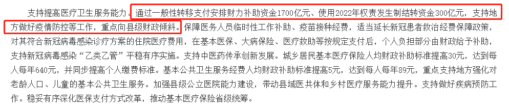 根據(jù)《預(yù)算報(bào)告》顯示,2023年,在醫(yī)療衛(wèi)生服務(wù)方面,中央財(cái)政計(jì)劃通過一般性轉(zhuǎn)移支付安排財(cái)力補(bǔ)助資金1700億元、使用2022年權(quán)責(zé)發(fā)生制結(jié)轉(zhuǎn)資金300億元,支持地方做好疫情防控,重點(diǎn)向縣級(jí)財(cái)政傾斜。