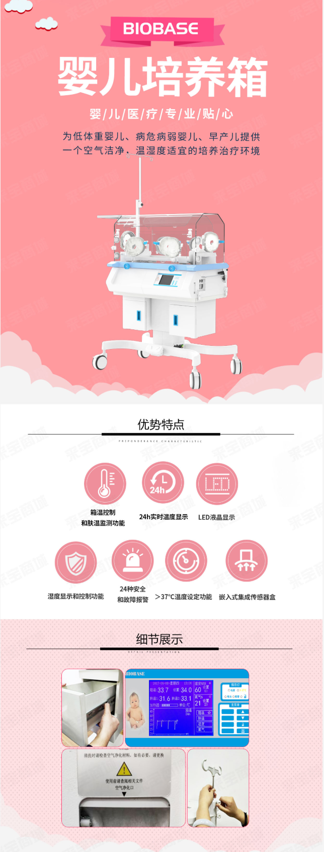 博科保育嬰兒培養箱具有箱溫控制和膚溫監測功能,實時監測嬰兒的身體表面濕度,LCD大尺寸液晶屏顯示,20多種綜合報警設計,嬰兒床角度無級可調,具有電動升降底座,滿足人員不同使用需求,為新生兒健康成長保駕護航!