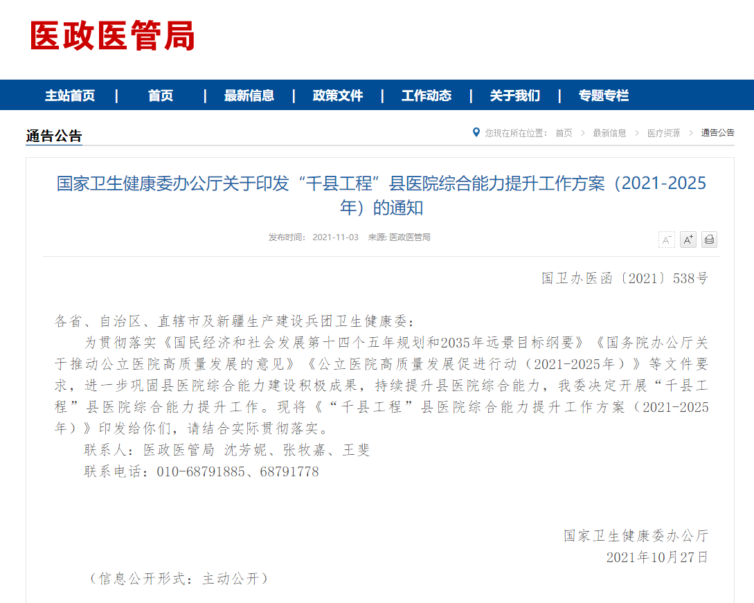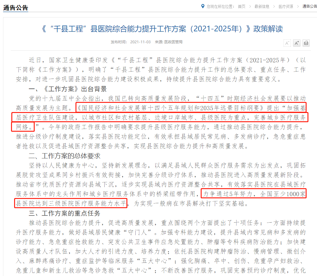 工作安排:自2021年10月至12月啟動(dòng),力爭(zhēng)通過5年努力,全國至少1000家縣醫(yī)院達(dá)到三級(jí)醫(yī)院服務(wù)水平。