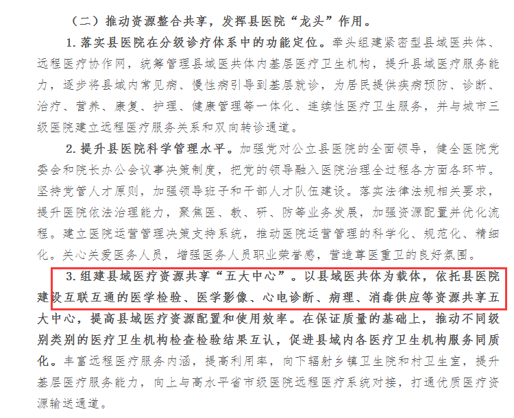 《工作方案》提到,要依托縣醫(yī)院建設(shè)互聯(lián)互通的醫(yī)學(xué)檢驗(yàn)、醫(yī)學(xué)影像、心電診斷、病理和消毒供應(yīng)等資源共享“五大中心”,提高縣域醫(yī)療資源配置和使用效率,在保證質(zhì)量的基礎(chǔ)上,推動(dòng)不同級(jí)別類別的醫(yī)療衛(wèi)生機(jī)構(gòu)檢查檢驗(yàn)結(jié)果互認(rèn),促進(jìn)縣域內(nèi)各醫(yī)療衛(wèi)生機(jī)構(gòu)服務(wù)同質(zhì)化;依托縣醫(yī)院建設(shè)縣域醫(yī)共體內(nèi)的醫(yī)療質(zhì)控、人力資源、運(yùn)營管理、醫(yī)保管理和信息數(shù)據(jù)等高質(zhì)量管理“五大中心”,強(qiáng)化縣醫(yī)院對(duì)縣域醫(yī)共體內(nèi)的醫(yī)療衛(wèi)生機(jī)構(gòu)的協(xié)調(diào)管理。