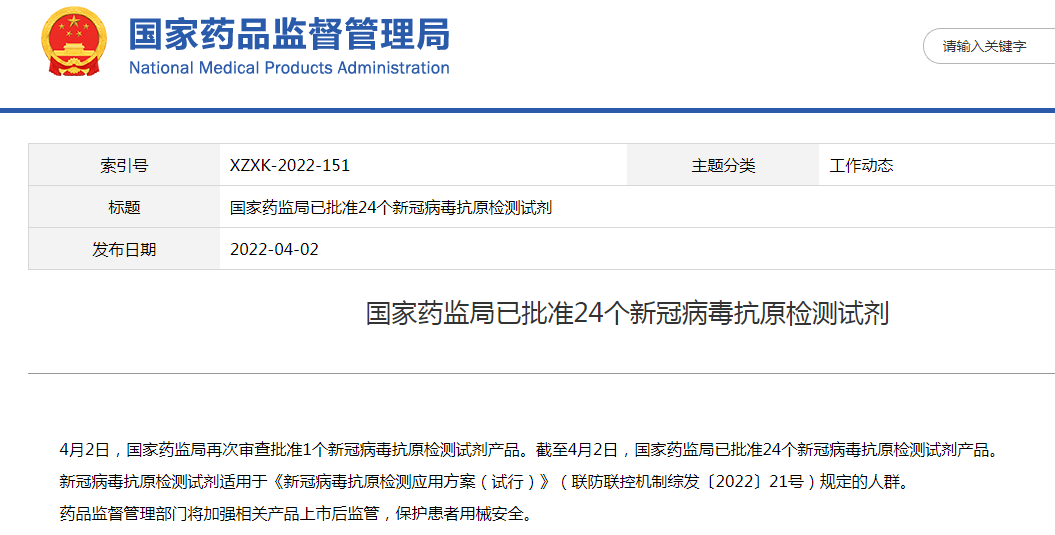 4月2日,國(guó)家藥監(jiān)局再次審查批準(zhǔn)1個(gè)新冠病毒抗原檢測(cè)試劑產(chǎn)品,山東博科診斷科技有限公司新型冠狀病毒(2019-nCoV)抗原檢測(cè)試劑盒(膠體金法)獲證。
