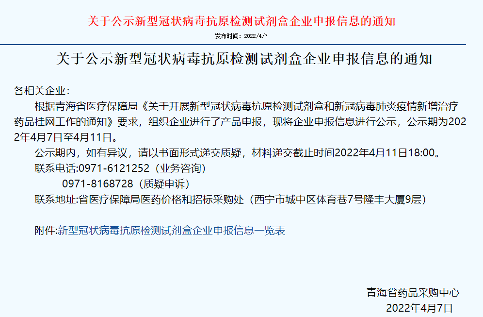 4月7日,青海省發(fā)布《關(guān)于公示新型冠狀病毒抗原檢測(cè)試劑盒企業(yè)申報(bào)信息的通知》,公示中標(biāo)企業(yè)及試劑價(jià)格。